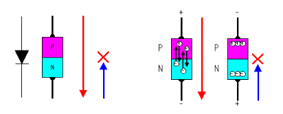 为解释MOS 场效应管的工作原理,我们先理解一下仅含有一个P—N结的二极管的工作过程。如图6所示,我们晓得在二极管加上正向电压(P端接正极,N端接负极)时,二极管导通,其PN结有电流经过。这是由于在P型半导体端为正电压时,N型半导体内的负电子被吸收而涌向加有正电压的P型半导体端,而P型半导体端内的正电子则朝N型半导体端运动,从而构成导通电流。同理,当二极管加上反向电压(P端接负极,N端接正极)时,这时在P型半导体端为负电压,正电子被汇集在P型半导体端,负电子则汇集在N型半导体端,电子不挪动,其PN结没有电流经过,二极管截止。