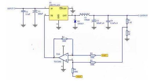 采用LM2576构成的降压电路如图2所示,输出电压经R1和R2分压取样后送到减法器的正输入端,负端接VSET。VSET信号是单片机给出的电压信号,输出的取样电压减去D/A转换电压后得到误差信号。再将误差信号加上参考电压(VREF)1.23V, 将此结果送到LM2576的反馈端。