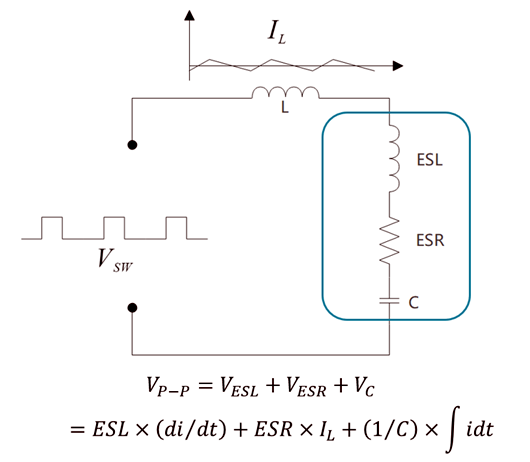 输出电容并非理想电容,存在寄生参数,可分解为等效寄生电感(ESL),等效寄生电阻(ESR),电容(C)的串联电路,电感纹波电流流过输出电容时,会在ESL,ESR和C上产生电压纹波。